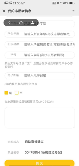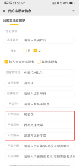 步骤三:填写我的志愿者信息。注:所在区县“郫都区”,所属高校“18禁